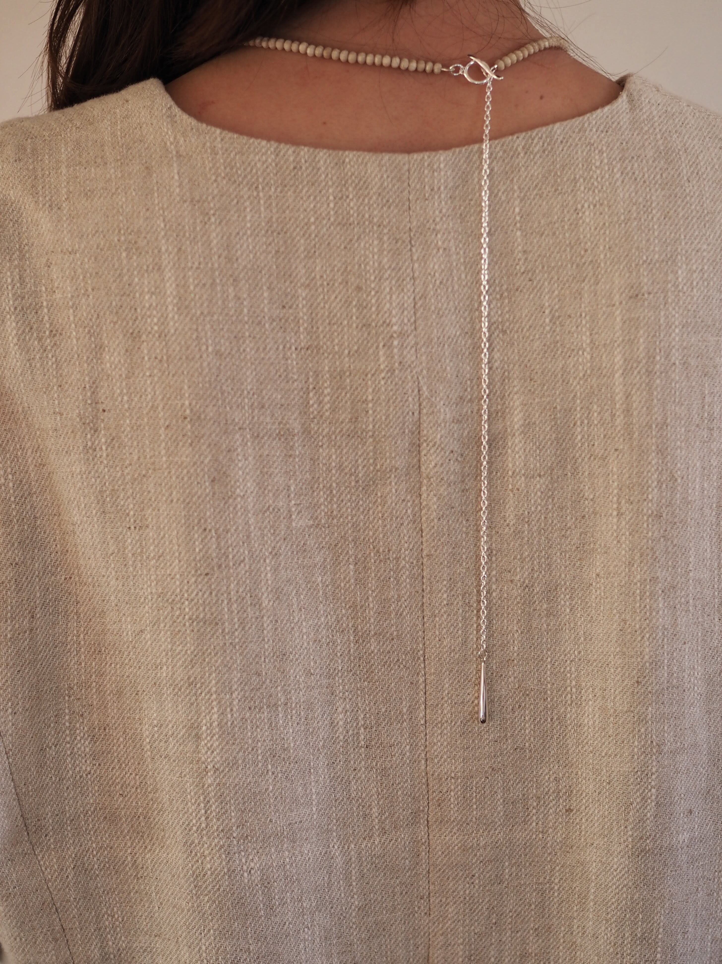 身につけ方で印象が変わる、長いチェーンを背中に垂らすスタイリングは、自分では見えないところにも気を配る感じがまたいいです。背中開きの服でなくても◎なネックレスです。