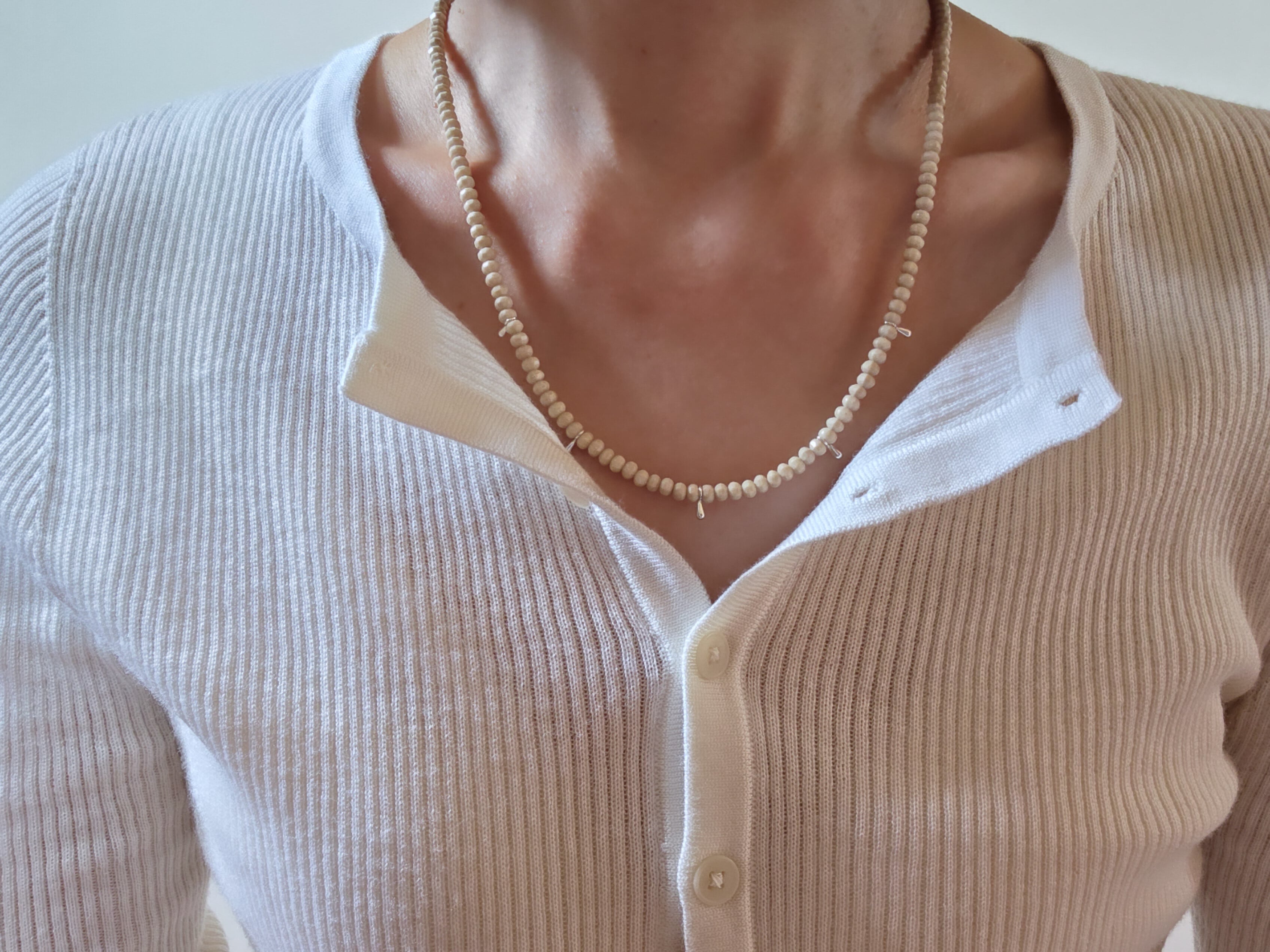 マットな質感と柔らかなきらめきを持ち合わせ、肌馴染みのいいベージュカラーは、主張よりも調和を基としている様は、互いの存在と微細に絡み続ける自然の営みと重なります。