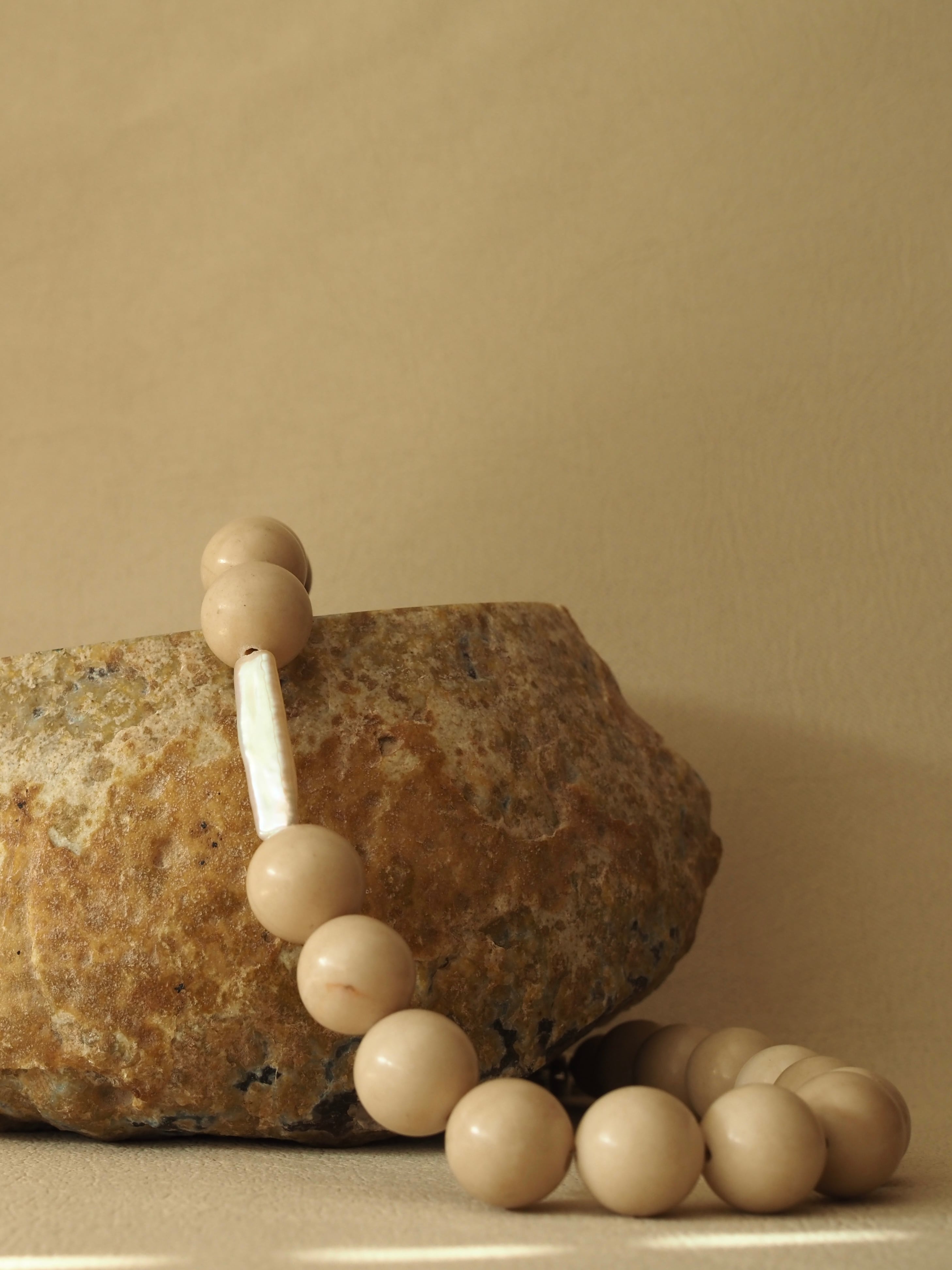 柔らかなベージュカラーの大きめ天然石に、AAAレクタングルパールがポイントのネックレス