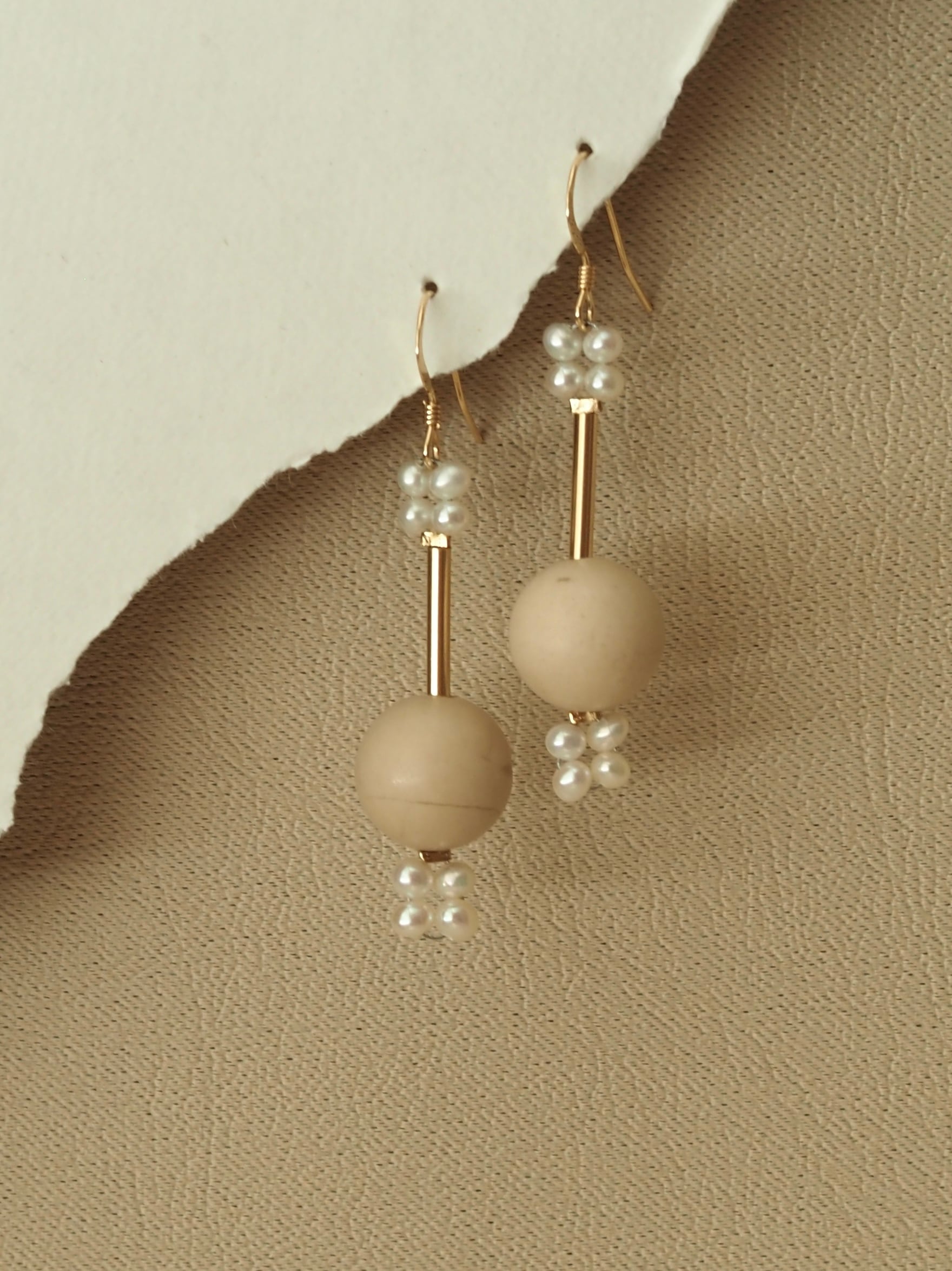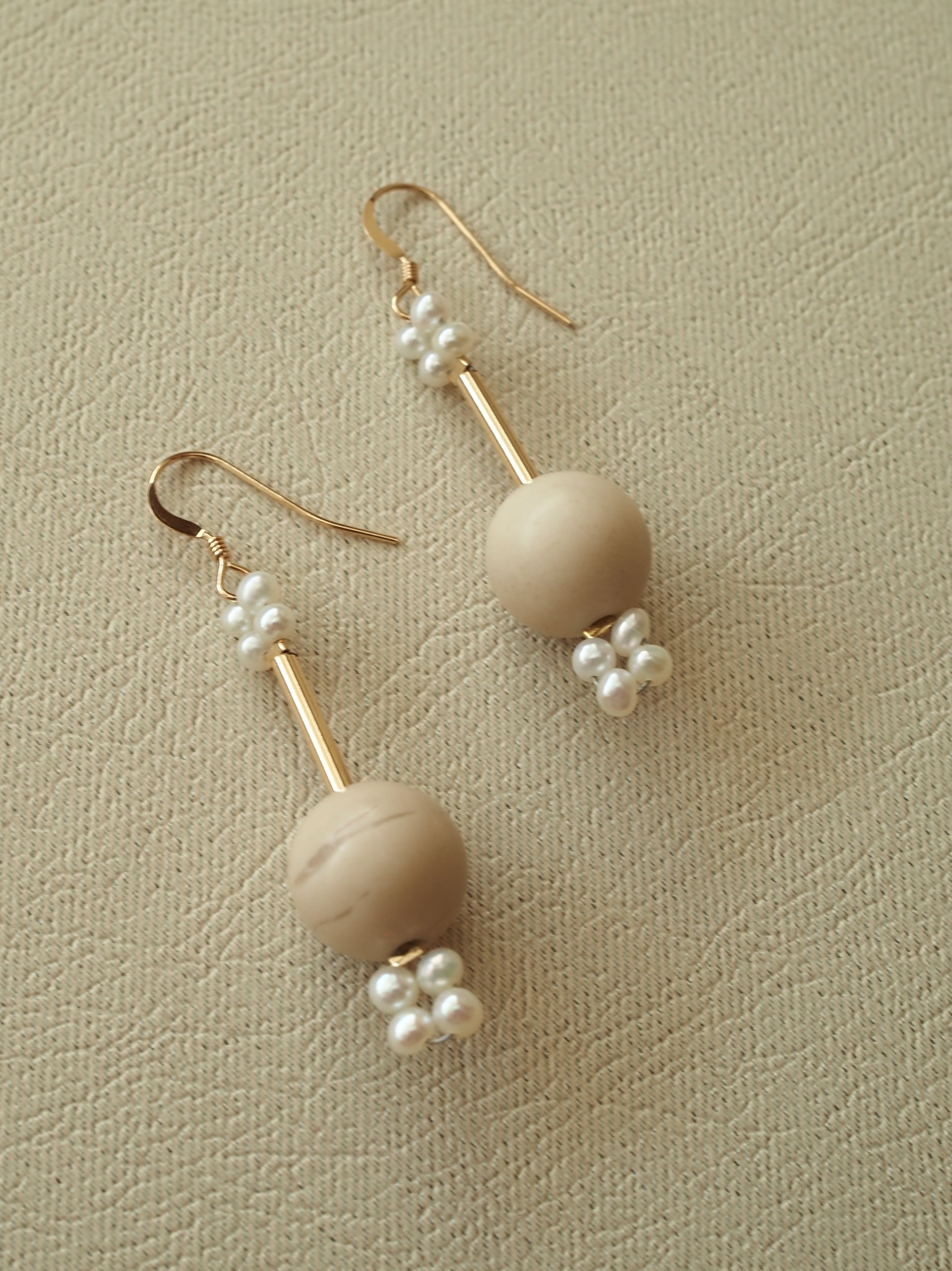 柔らかなニュアンスベージュの天然石とAAAランクの淡水パールをポイントにあしらっています